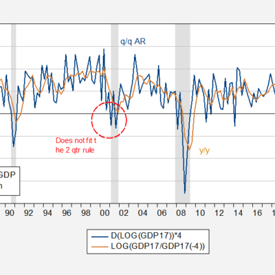 [ad_1] Or, Why We Don’t Use GDP Alone to Determine Business Cycle Dates. First, consider our various measures of output. Figure 1: GDP (blue), GDO