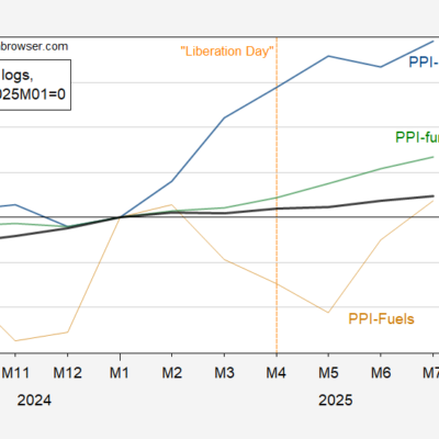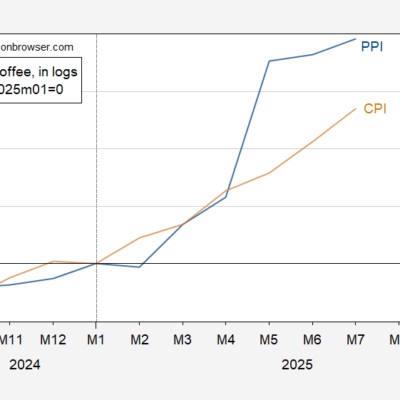 [ad_1] Here’re the July PPI and CPI for coffee. Figure 1: PPI for roasted coffee, n.s.a. (blue), and CPI for coffee, s.a. (tan), all in