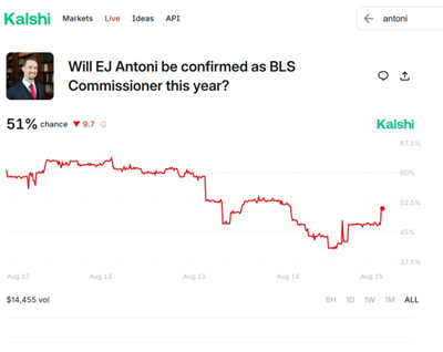 [ad_1] It’s really a statement on our times. Source; Kalshi, accessed 8/15/2025. As noted in an excellent article by Lauren Gurley in WaPo, these are