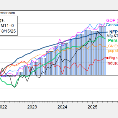 [ad_1] The picture as of today’s releases, with IP, retail sales below consensus. Figure 1: Nonfarm Payroll from CES (bold blue), implied NFP Bloomberg consensus