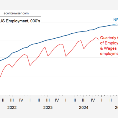 [ad_1] SP Global’s monthly GDP series is up (with prediction of flat GDP in Q3): Figure 1: Nonfarm Payroll from CES (bold