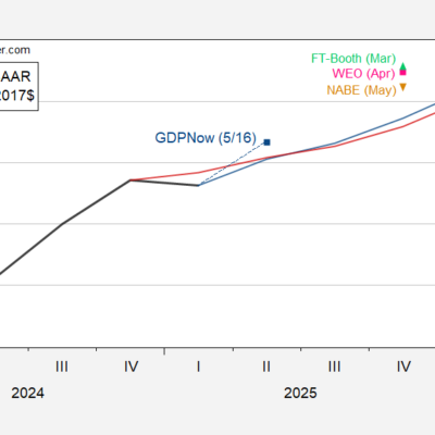 [ad_1] From NABE today: Here’s a comparison to other forecasts. Figure 1: GDP (black), May SPF (light blue), April WSJ (Red), March FT-Booth (green triangle),