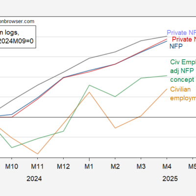 [ad_1] Transportation and warehousing boomed. Federal government workers on leave, taking buyouts not included yet (per convention). Figure 1: Cumulative log change since September 2024