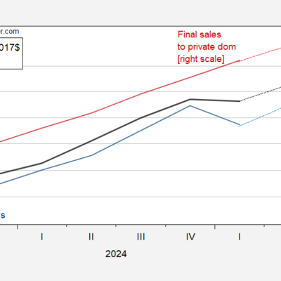 [ad_1] According to GDPNow of 4/8. However, GDP and final sales are both on a lower trajectory. Figure 1: GDP (bold black), GDPNow est of