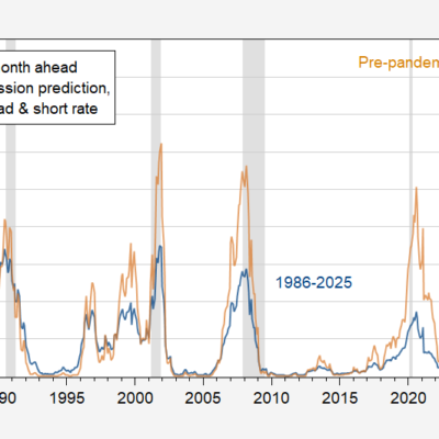 [ad_1] Probit regression recession on 10yr-3mo spread and 3 month interest rate: Figure 1: Estimated recession probability using 1986 onward sample (blue), using pre-pandemic sample