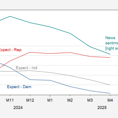 [ad_1] From the Michigan survey (final): Figure 1: Expectations of future economic conditions for Democrats/lean Democratic (blue, left scale), for Independents (gray, left scale), Republicans/lean