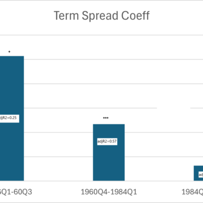[ad_1] Following up on the examination of what the term spread predicts, here’s the slope coefficients for the term spread, in regressions augmented with short