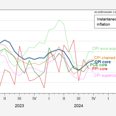 [ad_1] Core up, but supercore down: Figure 1: Instantaneous inflation for core CPI (blue), chained core CPI (tan), supercore CPI (pink), services supercore (light green), PPI
