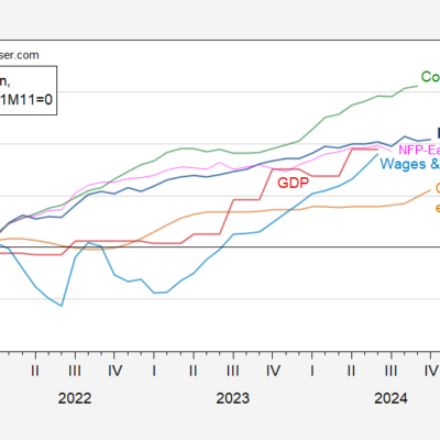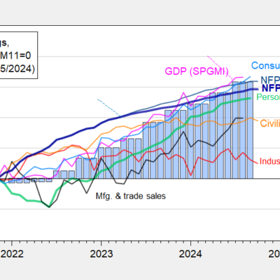 [ad_1] NFP and private NFP up (although below recent peaks), while civilian employment rises. Figure 1: Wisconsin Nonfarm Payroll Employment (dark blue), Philadelphia Fed early