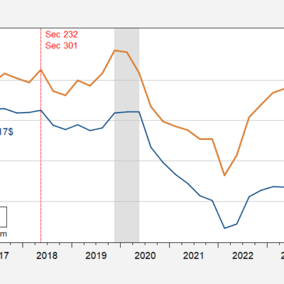 [ad_1] Answers: No. No. No. Figure 1: Net exports in bn.Ch.2017$ SAAR (blue, left scale), nominal as share of GDP (tan, right scale). NBER defined