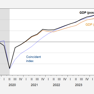 [ad_1] Upward revisions for both indices from University of Michigan Survey of Consumers: Figure 1: University of Michigan Consumer Sentiment for Democrats (blue, left scale),