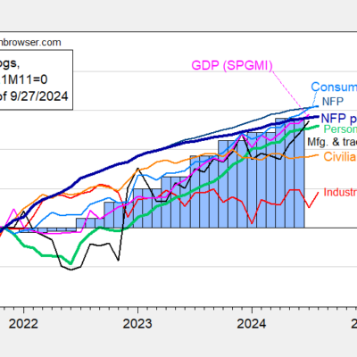 [ad_1] Still hard to see the recession in (preliminary) August 2024 data. Figure 1: Nonfarm Payroll (NFP) employment from CES (blue), implied NFP from preliminary