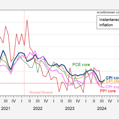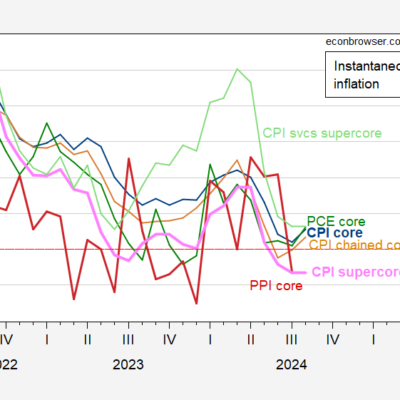 [ad_1] With the PPI release, and Cleveland Fed PCE nowcast as of today: Figure 1: Instantaneous inflation for core CPI (blue), chained core CPI (tan),