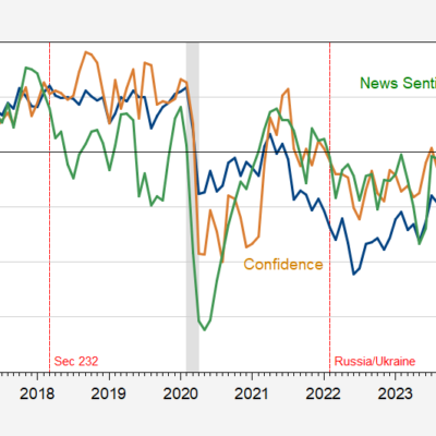 [ad_1] Figure 1: University of Michigan Consumer Sentiment (blue, left scale), Conference Board Consumer Confidence (tan, left scale), both demeaned and normalized by standard deviation