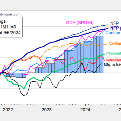 [ad_1] Including monthly GDP out today from S&P Global Market Insights, and preliminary benchmark NFP: Figure 1: Nonfarm Payroll (NFP) employment from CES (bold blue), implied
