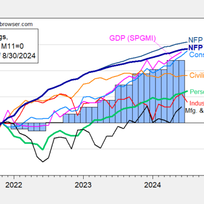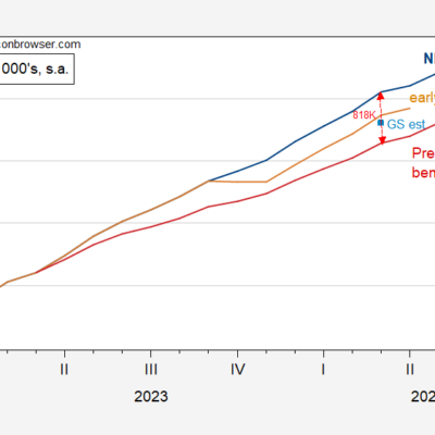 [ad_1] Recall the preliminary benchmark deduced 818K from the March NFP reading. Figure 1: Level of nonfarm payroll employment from CES (blue), implied from CES preliminary