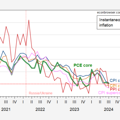 [ad_1] M/M Core PCE inflation at consensus. Figure 1: Instantaneous inflation for core CPI (blue), chained core CPI (tan), supercore CPI (pink), PPI core (red), and