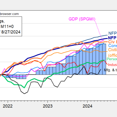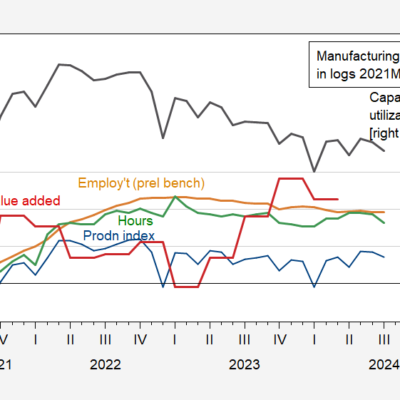 [ad_1] Preliminary benchmark revision takes down March employment by 0.9%. Here’s a picture of various series relevant to the manufacturing sector. Figure 1: Manufacturing production