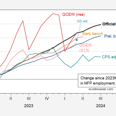 [ad_1] All show gains since January 2023, save the CPS based. Figure 1: Cumulative change in NFP employment according to CES (bold black), implied preliminary
