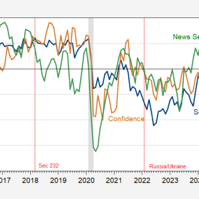 [ad_1] Conference Board’s Confidence Index exceeds consensus (103.3 > 100.9), with July index revised up. Here’re August readings for confidence, sentiment and news. Figure 1: