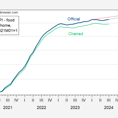 [ad_1] Prices are up relative to January 2021, but not relative to January 2024: Figure 1: CPI – food at home (blue), ERS forecast as