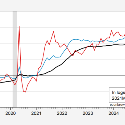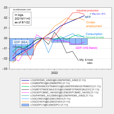 [ad_1] Preliminary NFP count is down 6.5K (on 3 million), unemployment rate up 0.1 ppts. Figure 1: Nonfarm payroll employment (blue, left scale), early benchmark