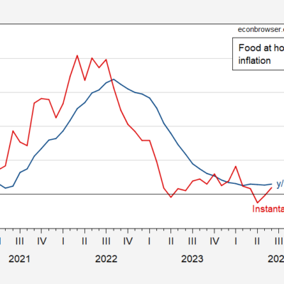 [ad_1] Through June: A comparison of conventional year-on-year vs. instantaneous. Figure 1: Food at home CPI component, y/y (blue), instantaneous per Eeckhout (2023), T=12, a=4