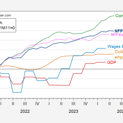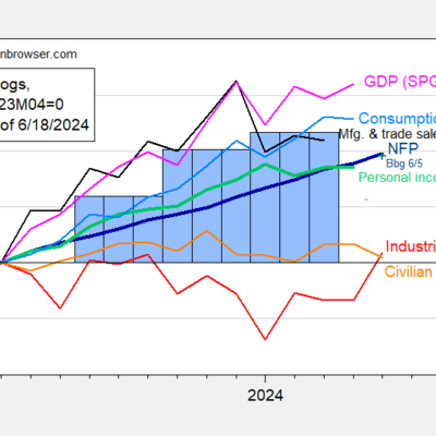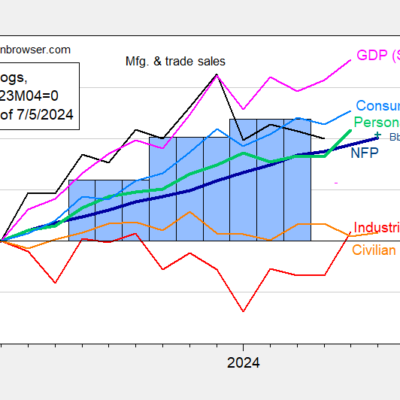 [ad_1] NFP at +206K vs +191K. Figure 1: Nonfarm Payroll (NFP) employment from CES (bold blue), civilian employment (orange), industrial production (red), personal income excluding current