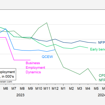 [ad_1] With the release of the Philadelphia Fed early benchmark, we have the following 12 month changes in employment (000’s) from different sources: From May