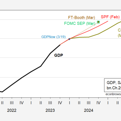 [ad_1] The FT-Booth Macroeconomist Survey was released today. GDP is slated to grow 2.1% in 2024, q4/q4. Figure 1: GDP (bold black), CBO projection (blue),