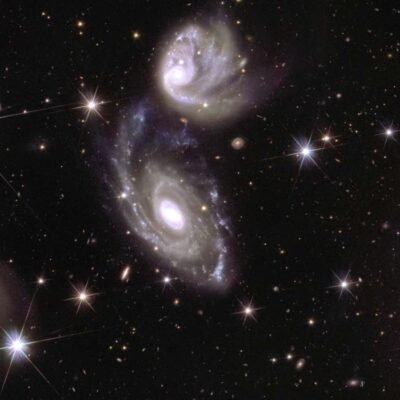 [ad_1] The interaction between two distant galaxies, captured by Euclid ESA A mosaic of images from the European Space Agency’s Euclid space telescope captures more