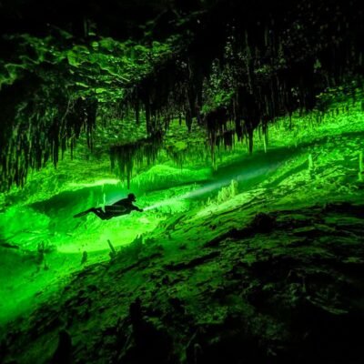 Cave diver explores a Mexican sinkhole in atmospheric photograph